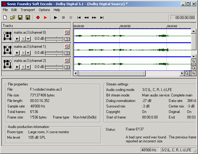 Transcoding an AC3 FileThe only program I know of that allows complete AC3 decoding and encoding is Sonic Foundry Soft Encode. As usual with commercial tools you will not find this software in the download section. Soft Encode is rather easy to understand, play around a little and you'll learn how it works. You can create your own Dolby Digital soundtracks using WAV files. Just open the files and Soft Encode will show you the track on the left and a waveform preview on the left. There will be a small logo with 6 dots representing the channels of a Dolby Digital file, starting with front left in the upper left corner. The white dot represents where the particular soundtrack will be located in the resulting ac3 file. But we want to transcode, not encode our own ac3 files so let's get to business..